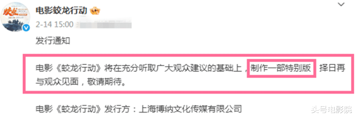 成果,说“毫不撤档”几天之后,《蛟龙行为》却在2月14日发文告记撤档,说“电影《蛟龙行为》将在充分听取雄壮不雅众提议的基础上,制作一部终点版,择日再与不雅众碰面,敬请期待”。
