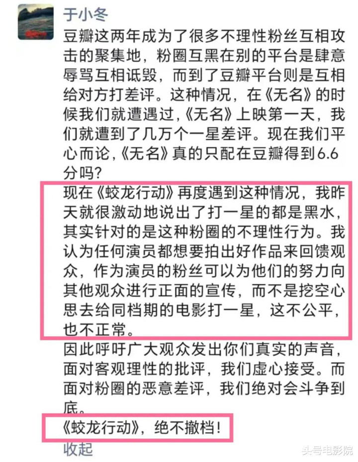 但在其时,面对口碑和票房的不利,总制片东说念主于冬在一又友圈发文,说“《蛟龙行为》被黑了”,攻讦某平台的用户挑升打低分,说“毫不撤档”,况且在路演现场说要“平正”。