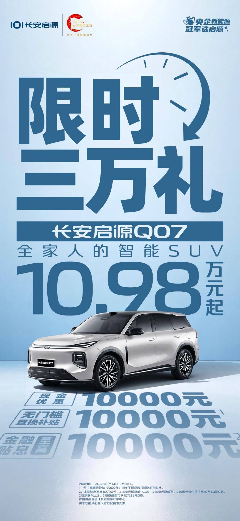 正好三月购车旺季,为让更多家庭舒适领有“诗和边远”,长安启源同步推出力度空前的“惠民焕新购车季”计策。