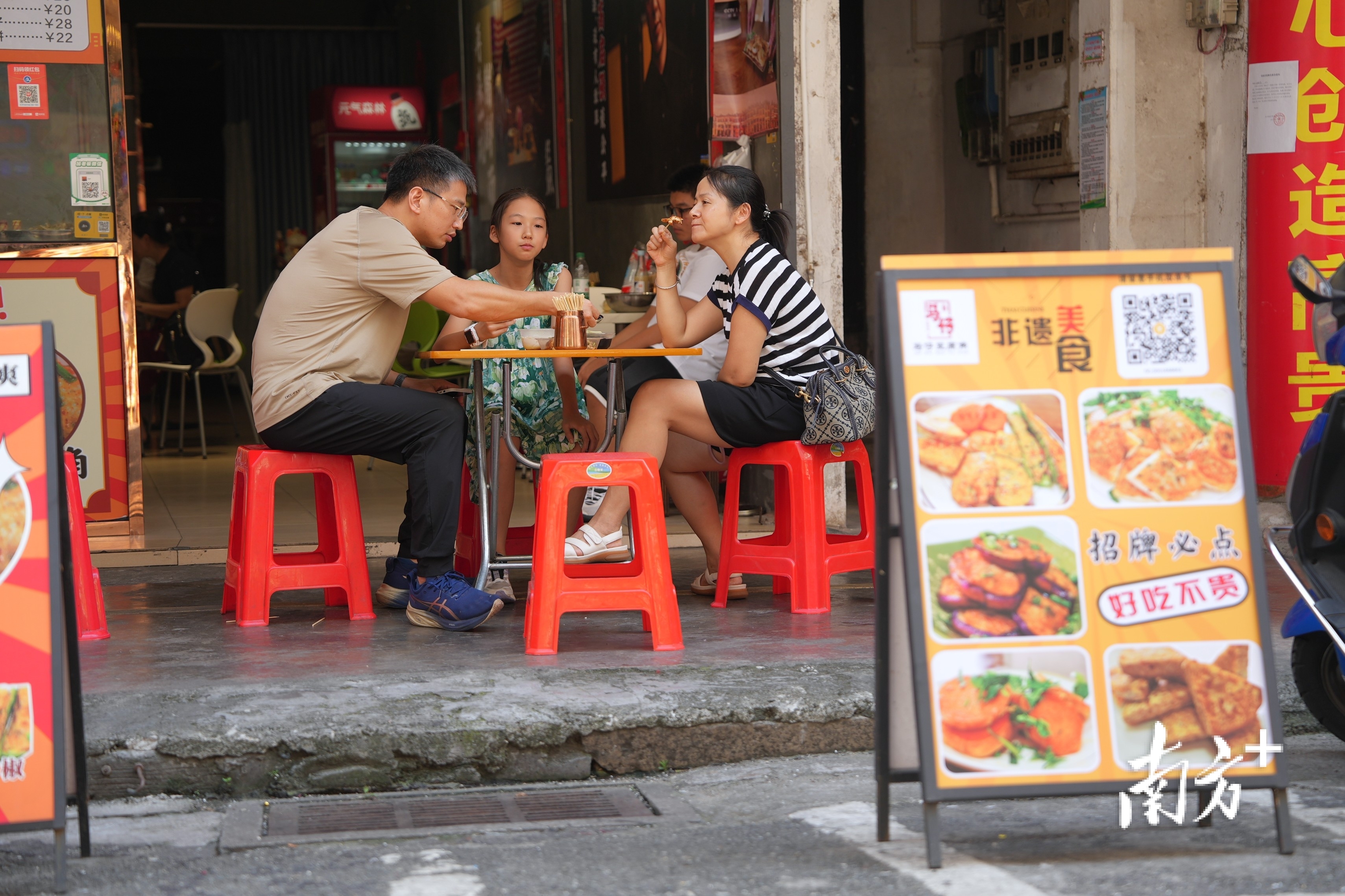 旅客在历史文化街区的街边放开吃喝,畅聊东说念主生。