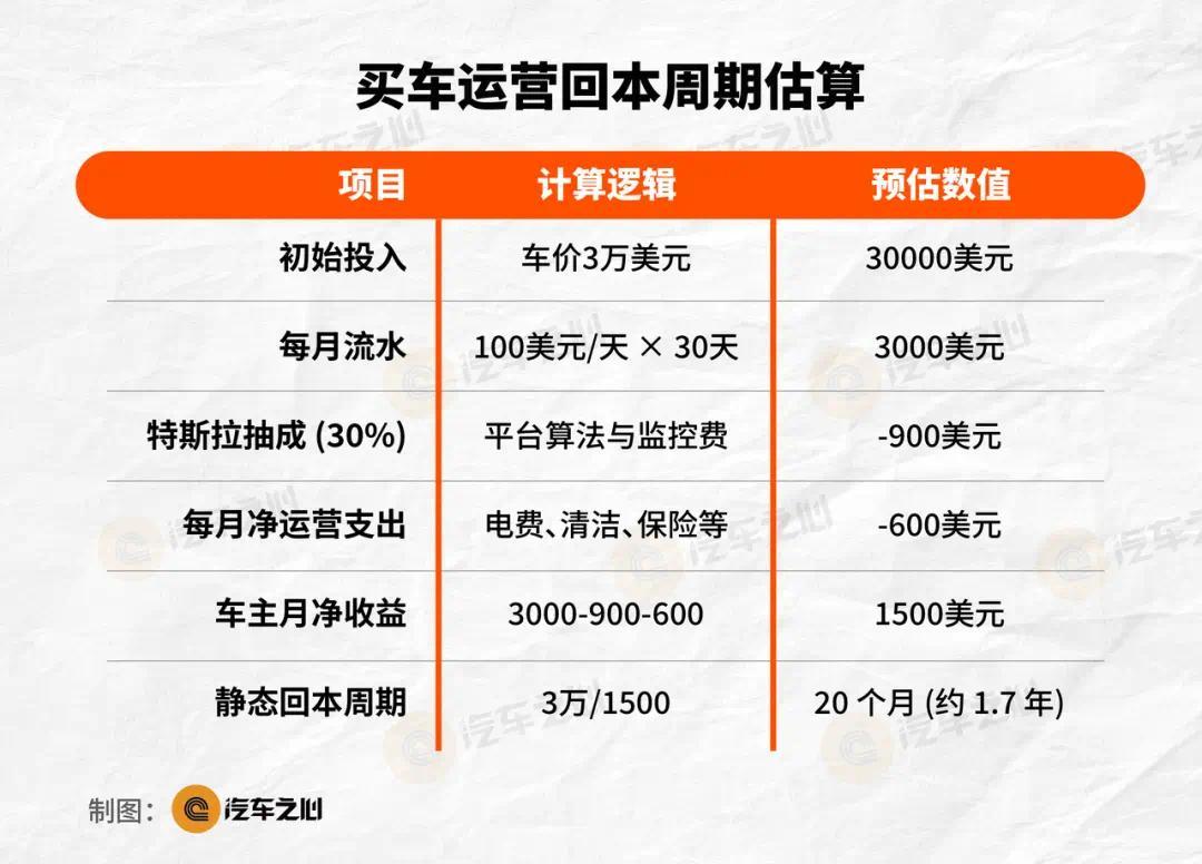 按照每月 3000 好意思元活水,与必要的清洁、保障、电费等老本测算,车主单月收益不错有 1500 元好意思金,静态回本周期约 20 个月,不到两年。