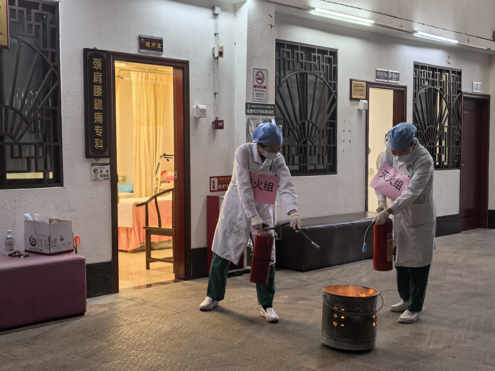 第二场景模拟别称就诊东说念主员因未带医保卡无法报销而心生起火,偷用休养车上的乙醇放火。理疗室共事发现火情后,立即按下失火报警器,并提起隔壁熄灭器赶往现场扑救。救急小组同步组织东说念主员疏散,隔壁共事接驳消防水枪实时将火扑灭。扫数演练历程垂危有序,各体式衔尾精采。