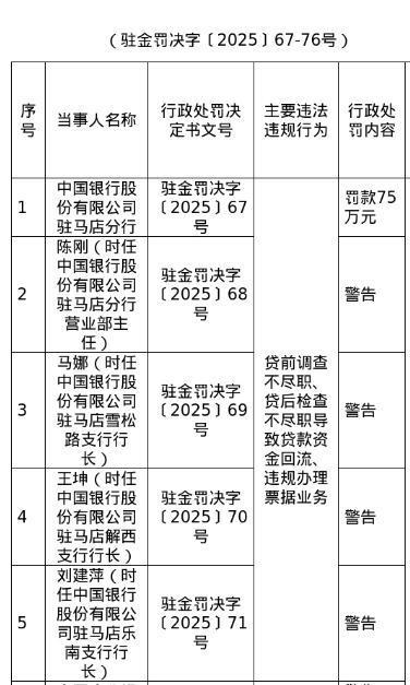 罚单表示,中国银行股份有限公司驻马店分行的主要违警非法事实为:贷前造访不尽责、贷后检查不尽责导致贷款资金回流、非法办理单据业务。
